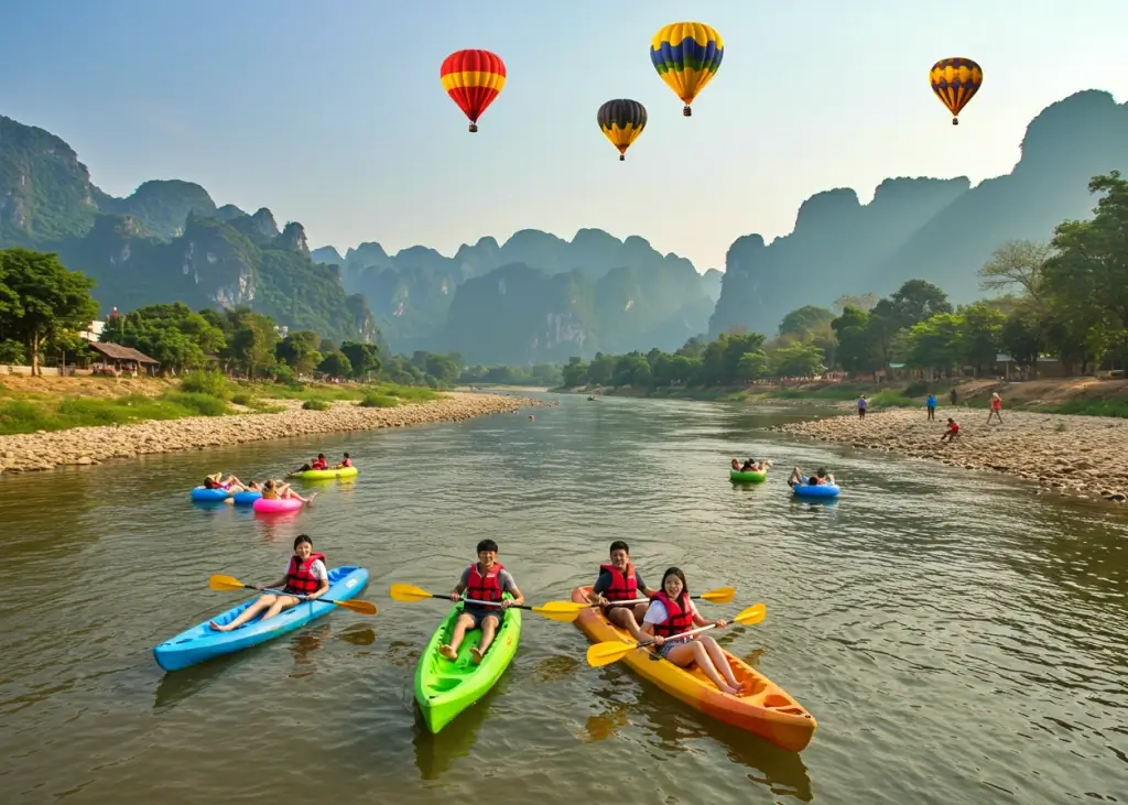 1. 카약킹: 쏭강의 아름다운 풍경을 따라 유유히 카약을 타고 내려오는 힐링의 시간입니다. 방비엥의 기암괴석을 가장 가까이서 느낄 수 있습니다.